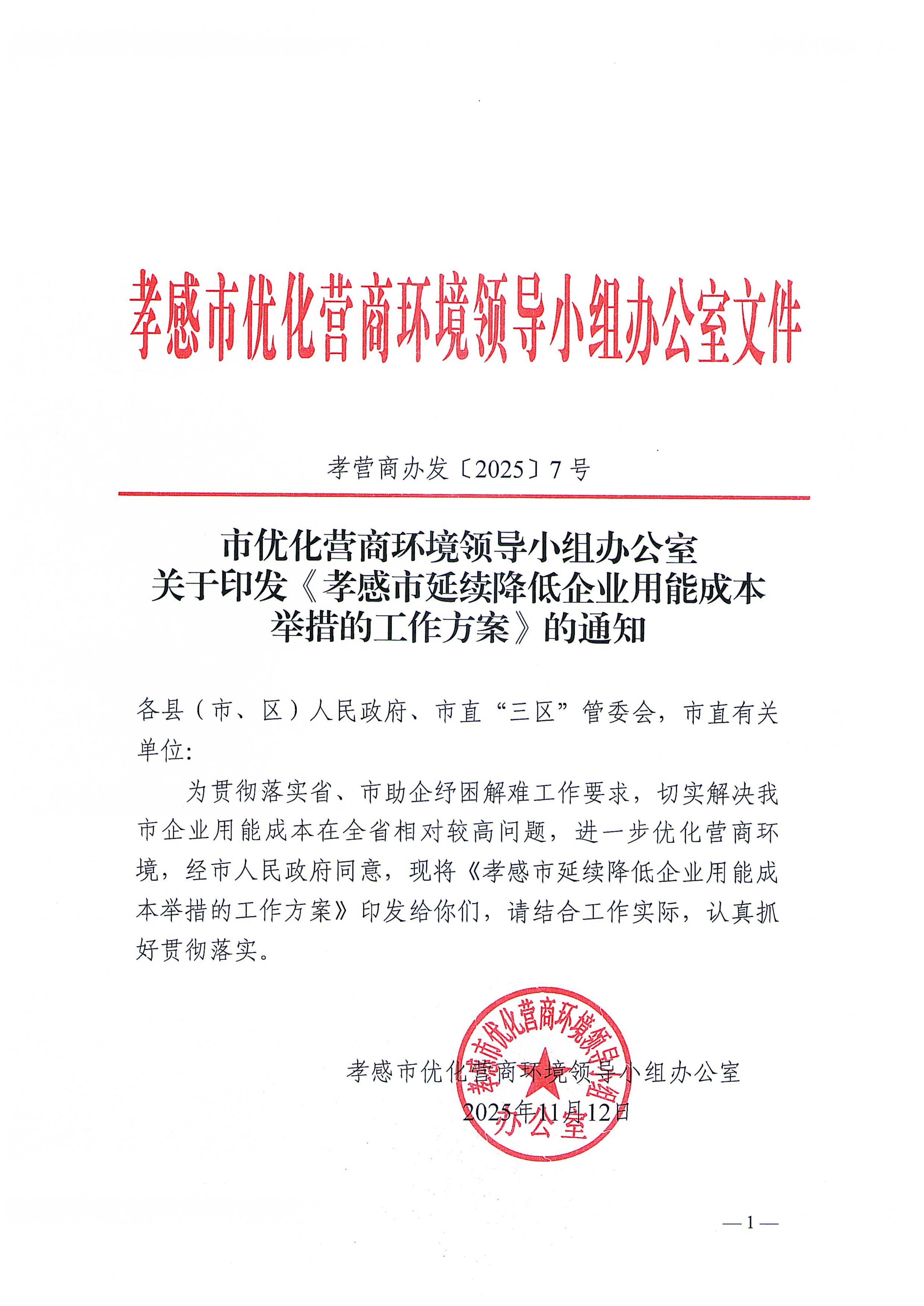 市優(yōu)化營商環(huán)境領導小組辦公室關(guān)于印發(fā)《孝感市延續(xù)降低企業(yè)用能成本舉措的工作方案》的通知